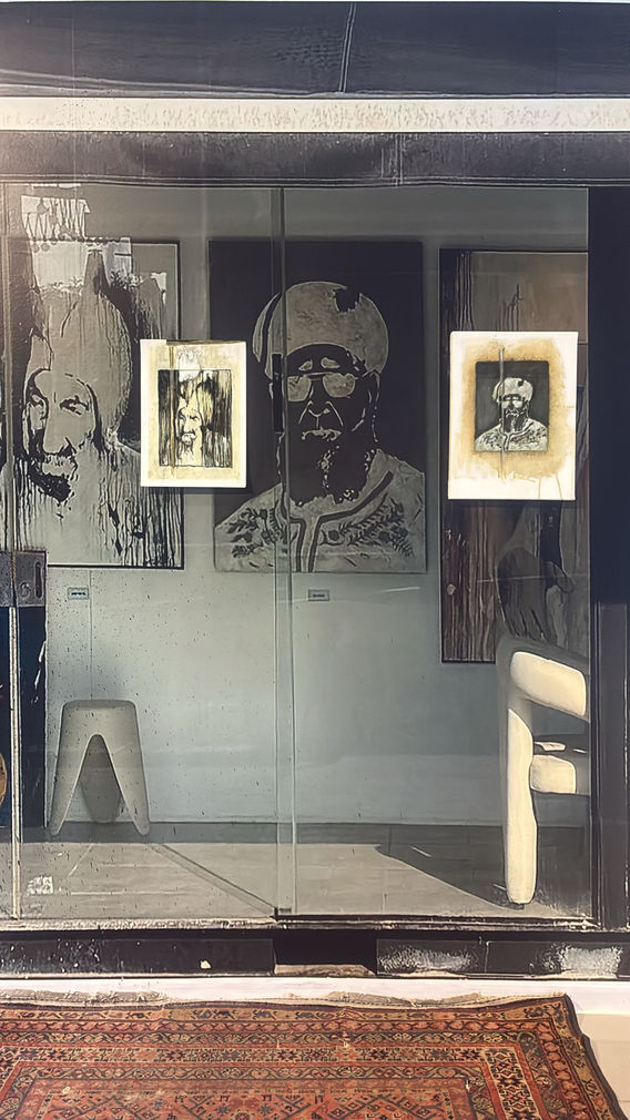 One trip south, to the memorial sites of the most recent war, produced a photograph that became the ground and backdrop for Eli Petel’s new exhibition, The South Pole. In the GT Center complex, on Baaley HaMelakha Street in Netivot stands the gallery of Eliran Galili. The rectangular building, with its long display window, looks like a pavilion designed by unruly students of Le Corbusier. In fact, it is a shipping container that was dropped into the vast commercial complex. Its glass facade reveals the gallery wall, lined with pictures: alongside colorful paintings of intimate jazz performances appear portraits of the Baba Sali, Rabbi Ovadia Yosef, and the Lubavitcher Rebbe. The figure of Rabbi Yoram Abergel of Netivot leans against the glass wall from the outside.